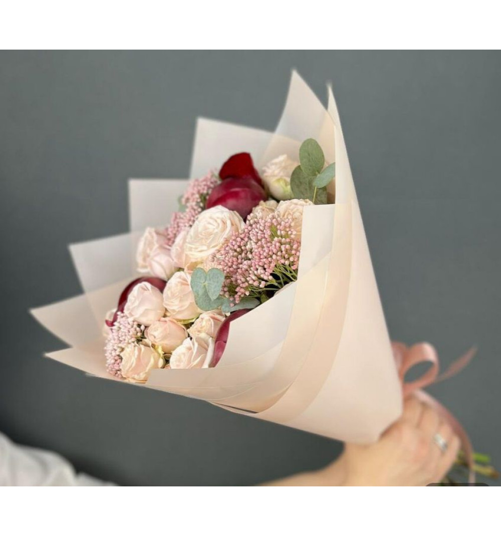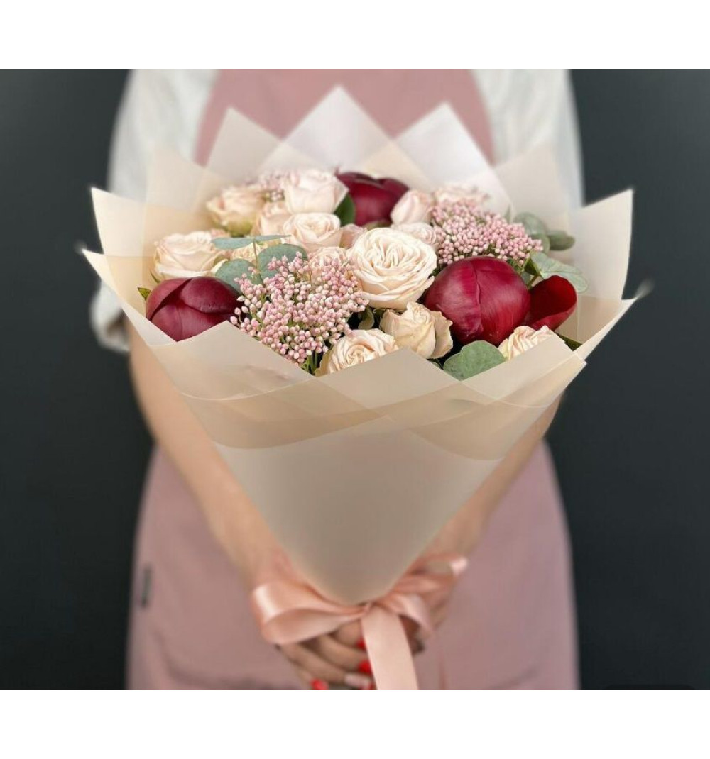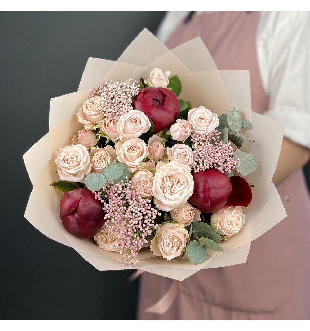 Купить Авторский букет из красных Пионов и кремовых кустовых Роз с Озотамнусом в Шахтинске за 20 000 ₸ | интернет-магазин «Guls»